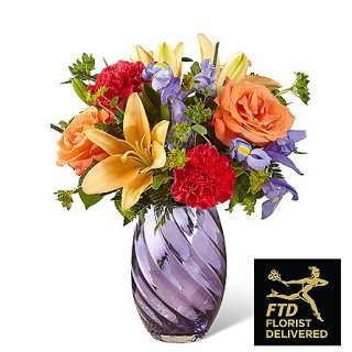 パープルの花瓶がおしゃれなカラフルブーケです。
