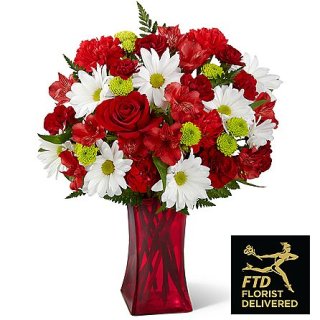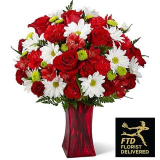 ホワイトデイジーとレッドローズの可愛いアレンジメントです。