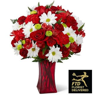 ホワイトデイジーとレッドローズの可愛いアレンジメントです。