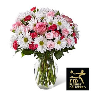 ホワイトデイジーとローズの可愛いアレンジメントです。