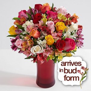 カラフルで可愛いアソートローズとアルストロメリアの豪華なブーケです。